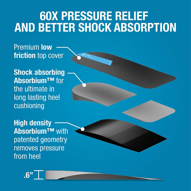 | Material: | Absorbium® makes the difference in Heel Defender Sport’s impact force reduction. Absorbium's® innovative and patented technology absorbs up to 90% of shock, providing added heel protection, superior pressure relief from high impact, better shock absorption, and increased comfort with or without socks. They come with a non-toxic and friction-reducing top cover which makes them the perfect sport insoles for high-intensity exercise. |