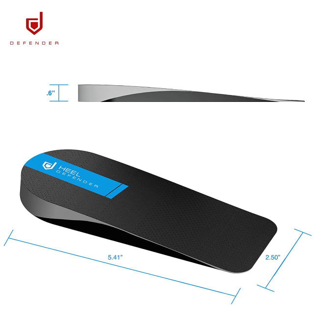 Heel DefenderSport inserts are 0.4 inches thick and weigh 3.4 ounces. They can be worn in dress shoes, flats, and running/sports shoes. These inserts are worn under the insole to keep them in place.